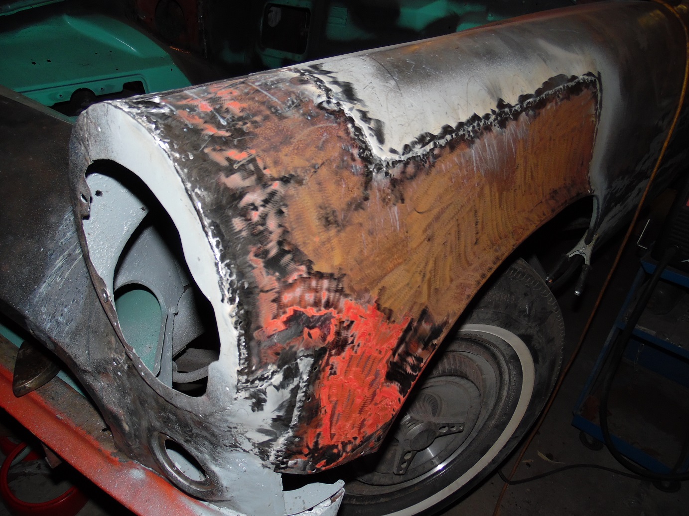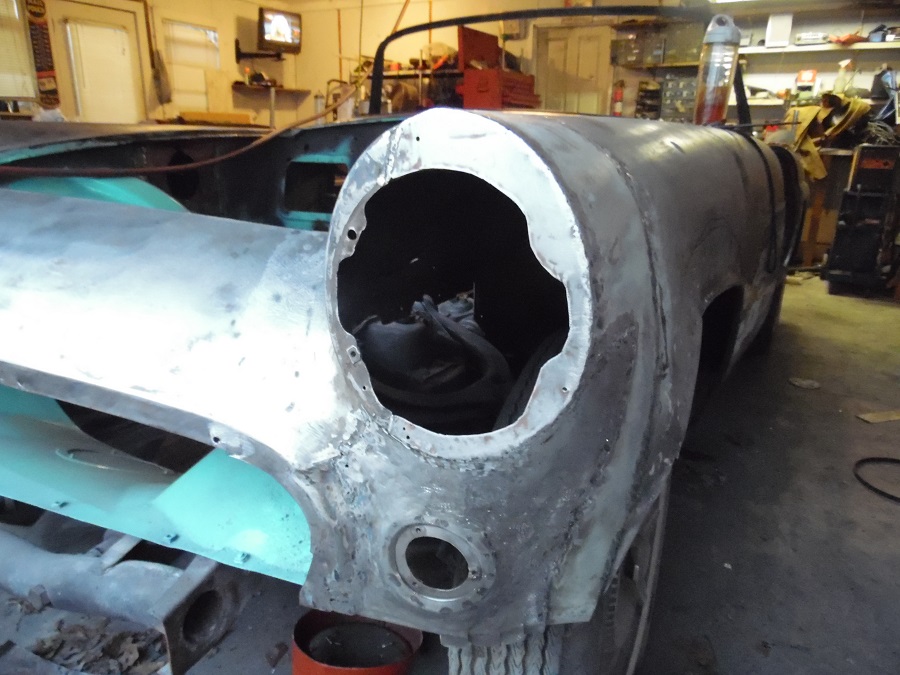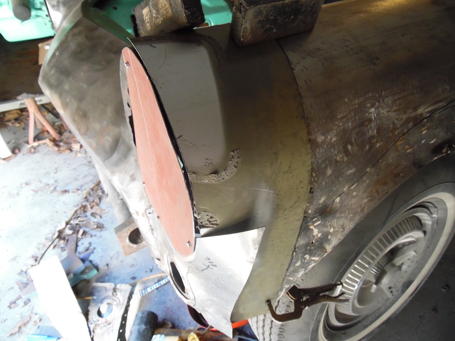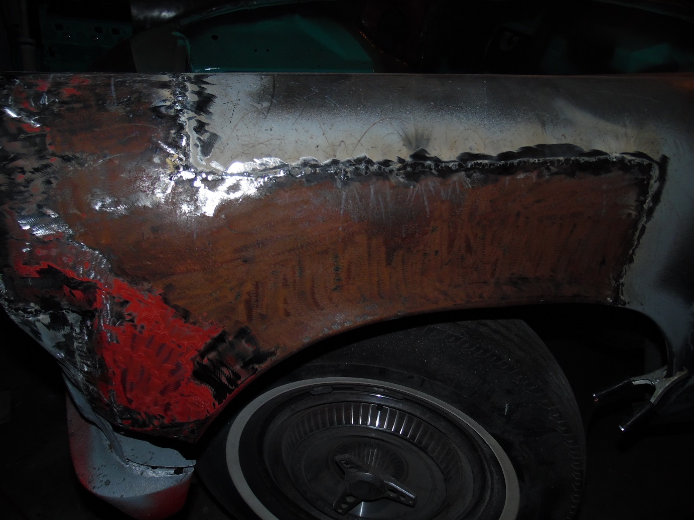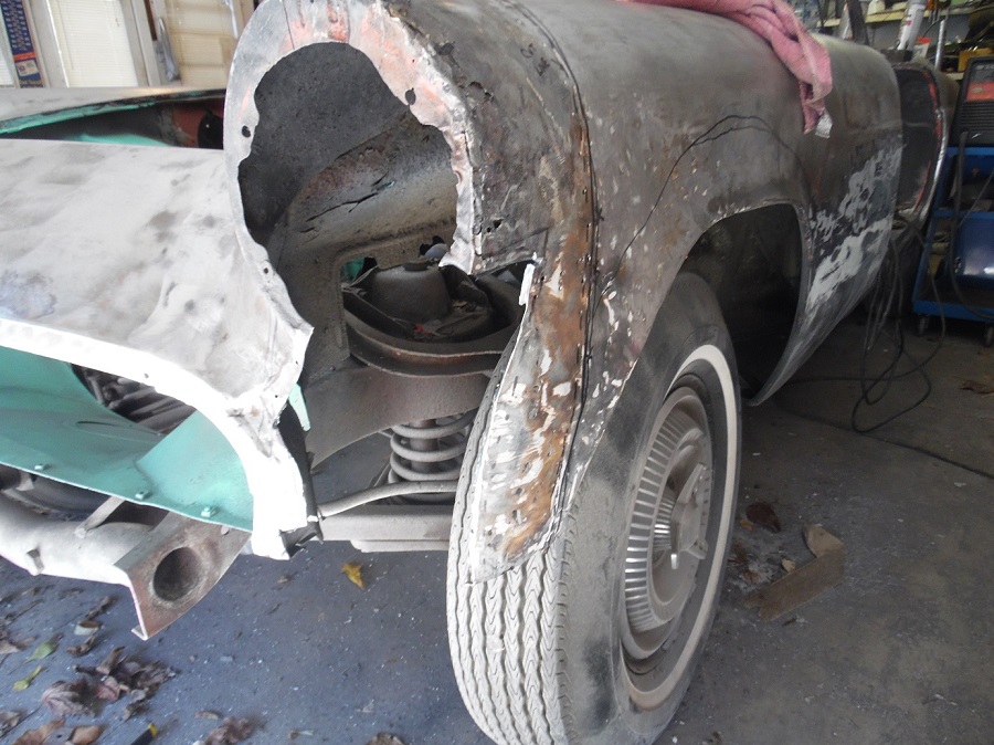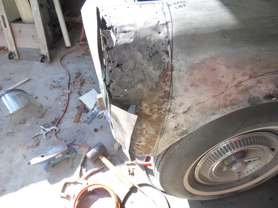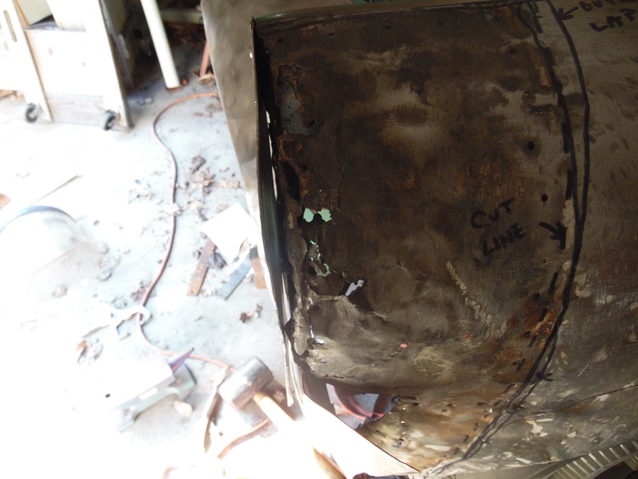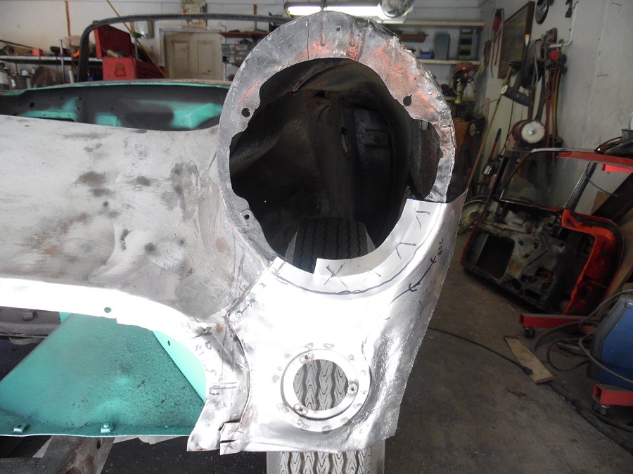 The weld has been removed here. The line drawn around the wheel well is the area that needs to be replaced. It has too many bends and flanges to make by hand. This part has been cut out of a fender on a salvage yard car. Just that piece of a fender took me a month to find and will cost over 600 bucks. A complete fender, if you can find one will run you as much as 2 grand.