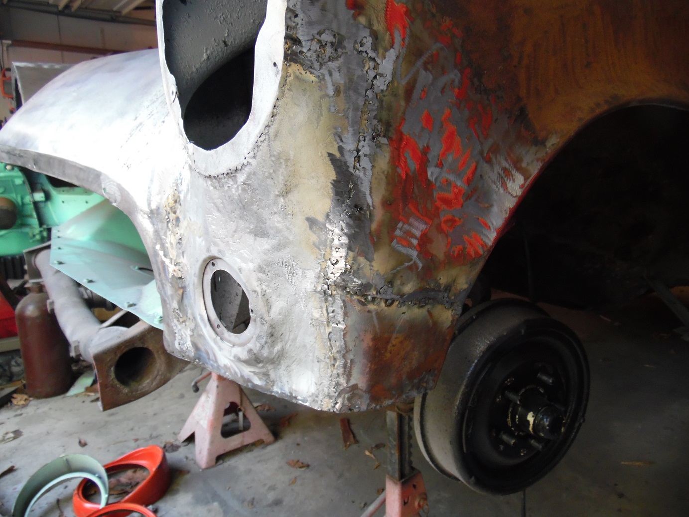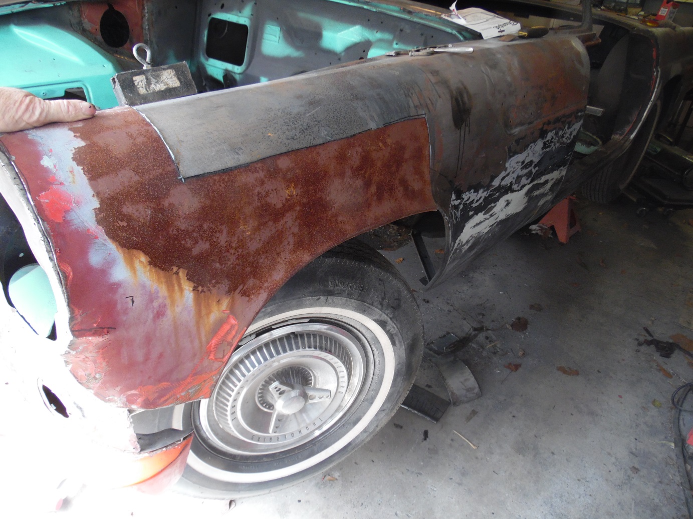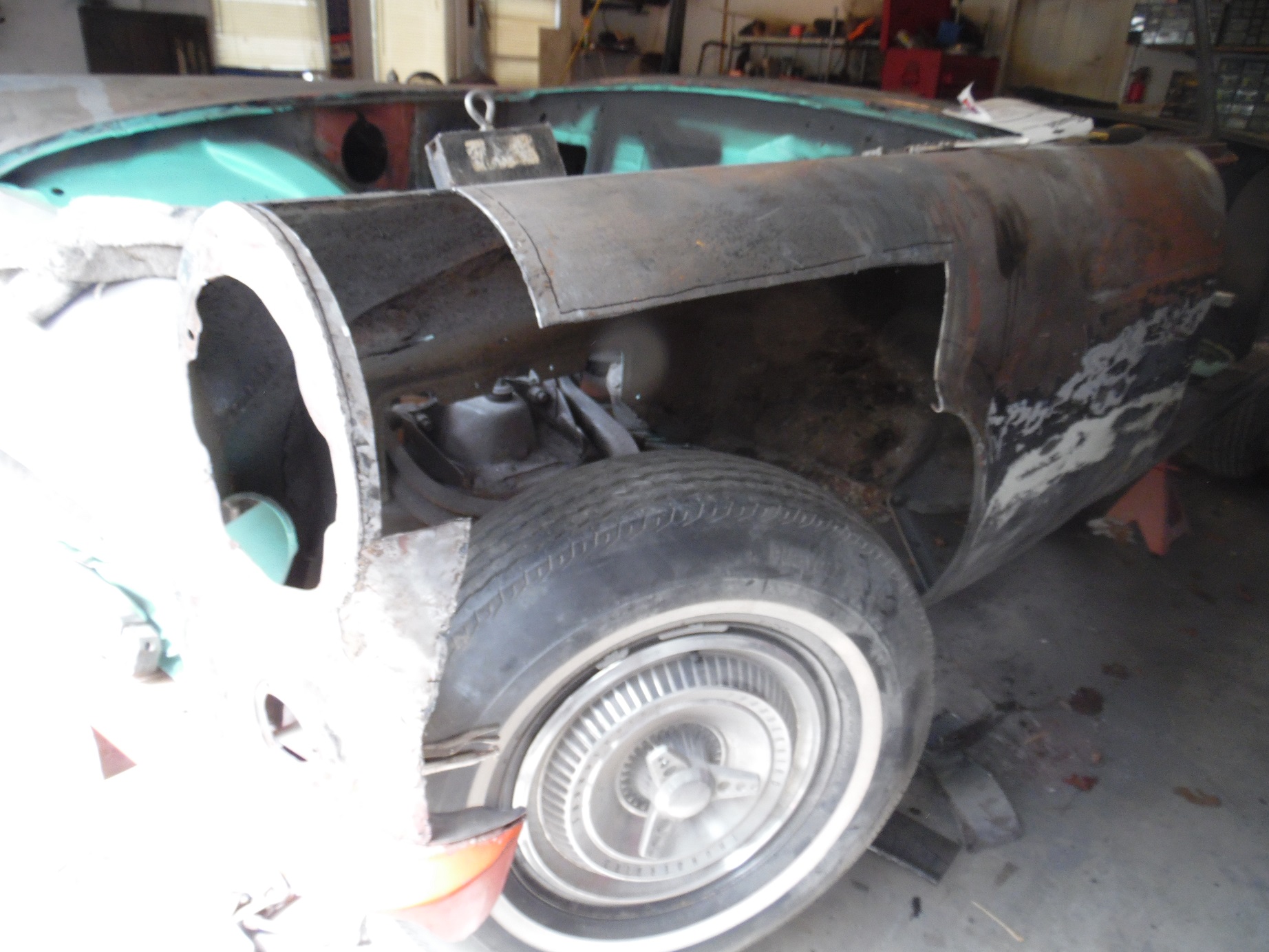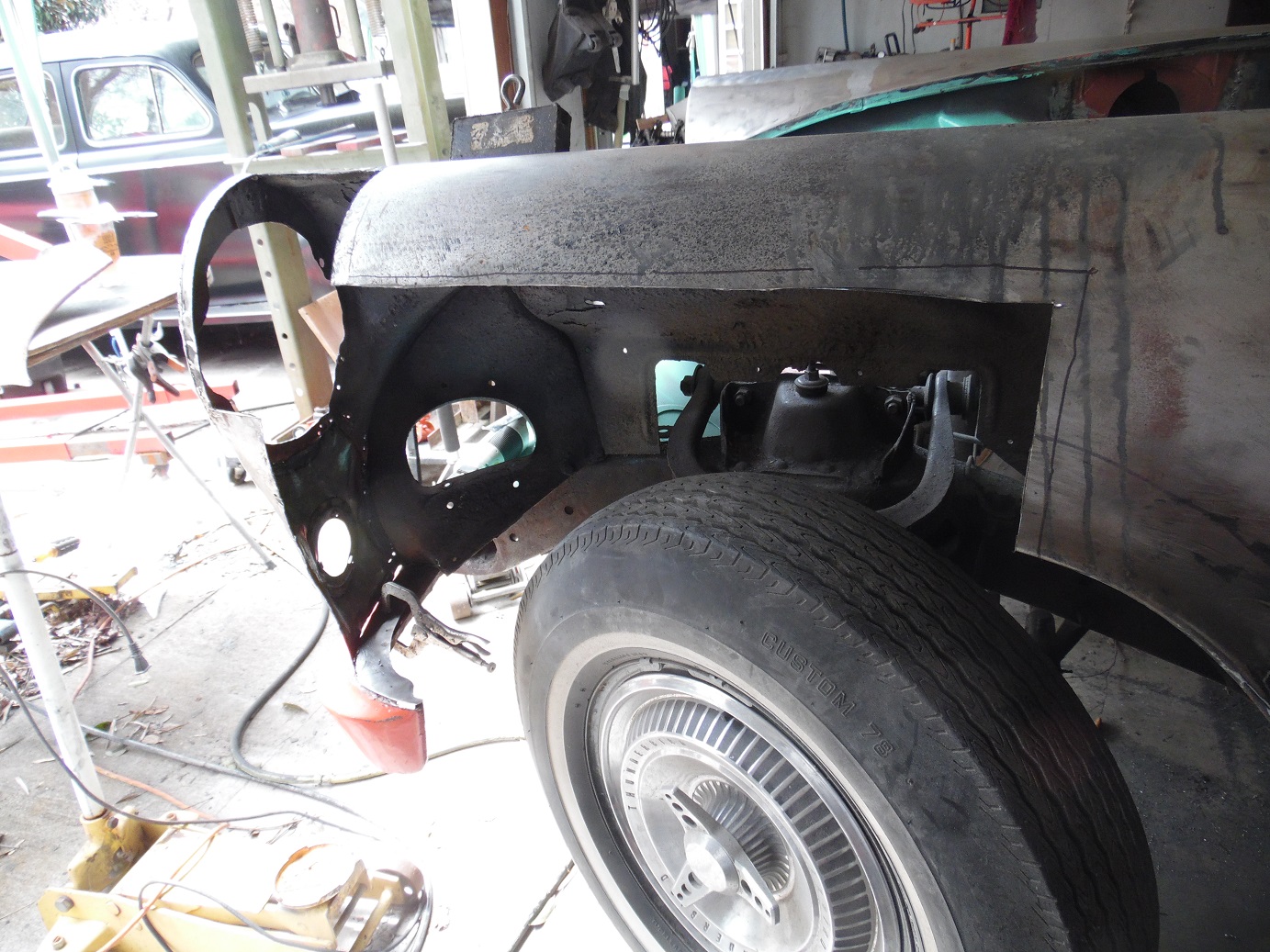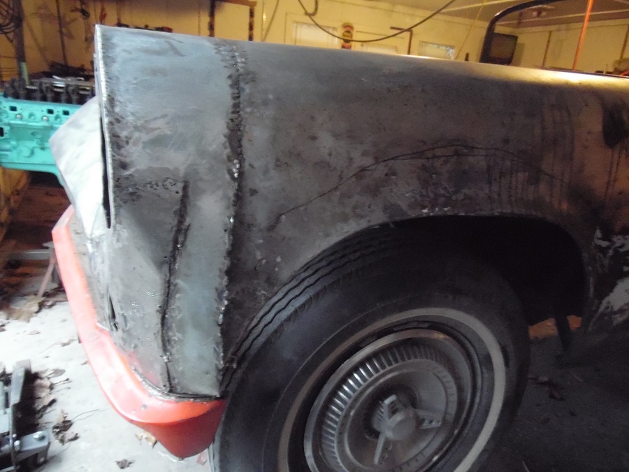 The weld has been removed here. The line drawn around the wheel well is the area that needs to be replaced. It has too many bends and flanges to make by hand. This part has been cut out of a fender on a salvage yard car. Just that piece of a fender took me a month to find and will cost over 600 bucks. A complete fender, if you can find one will run you as much as 2 grand.
