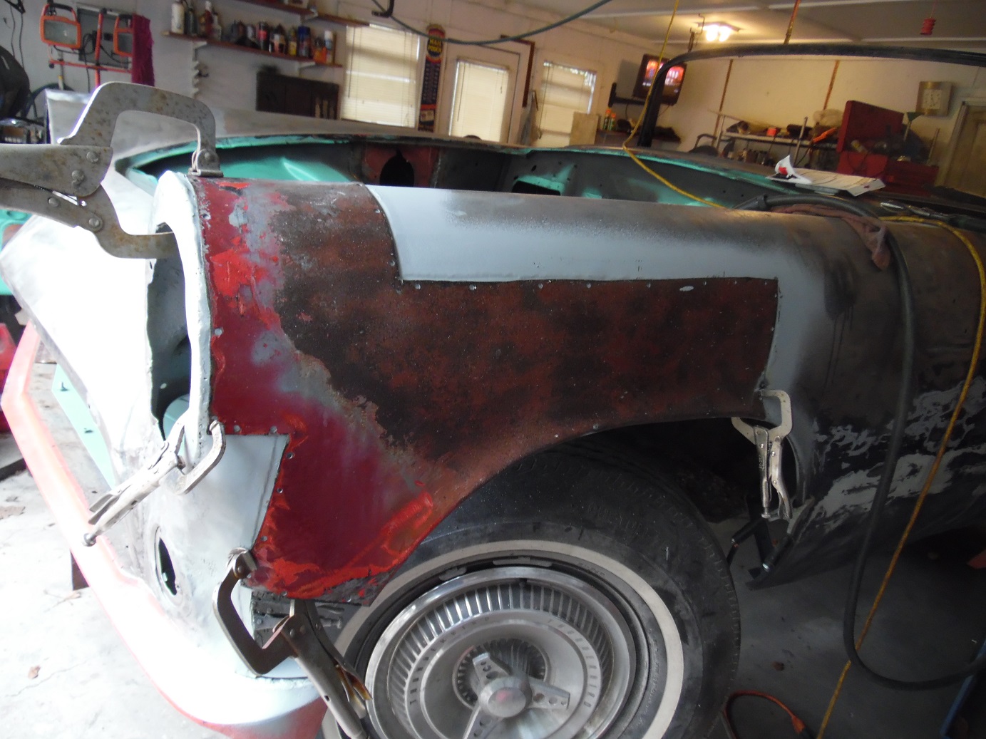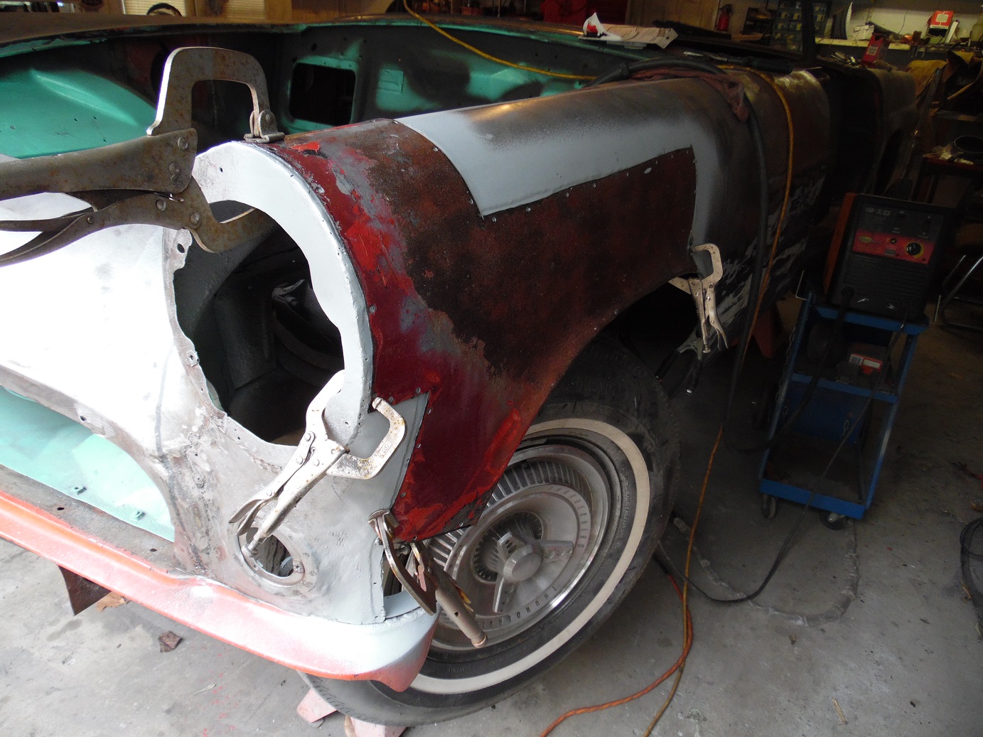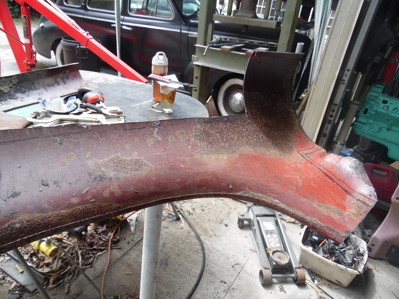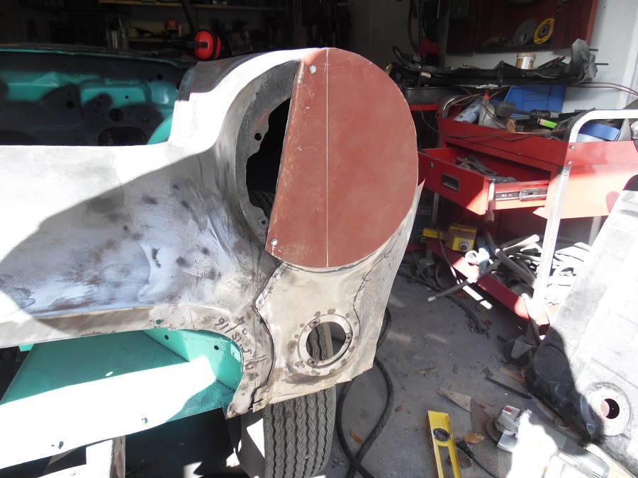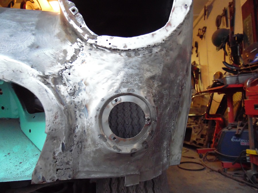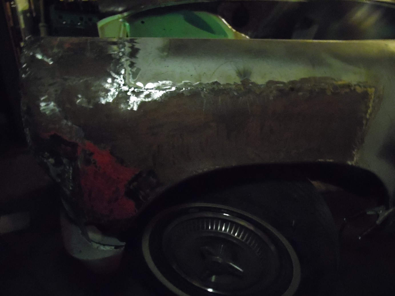 The weld has been removed here. The line drawn around the wheel well is the area that needs to be replaced. It has too many bends and flanges to make by hand. This part has been cut out of a fender on a salvage yard car. Just that piece of a fender took me a month to find and will cost over 600 bucks. A complete fender, if you can find one will run you as much as 2 grand.