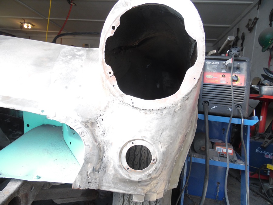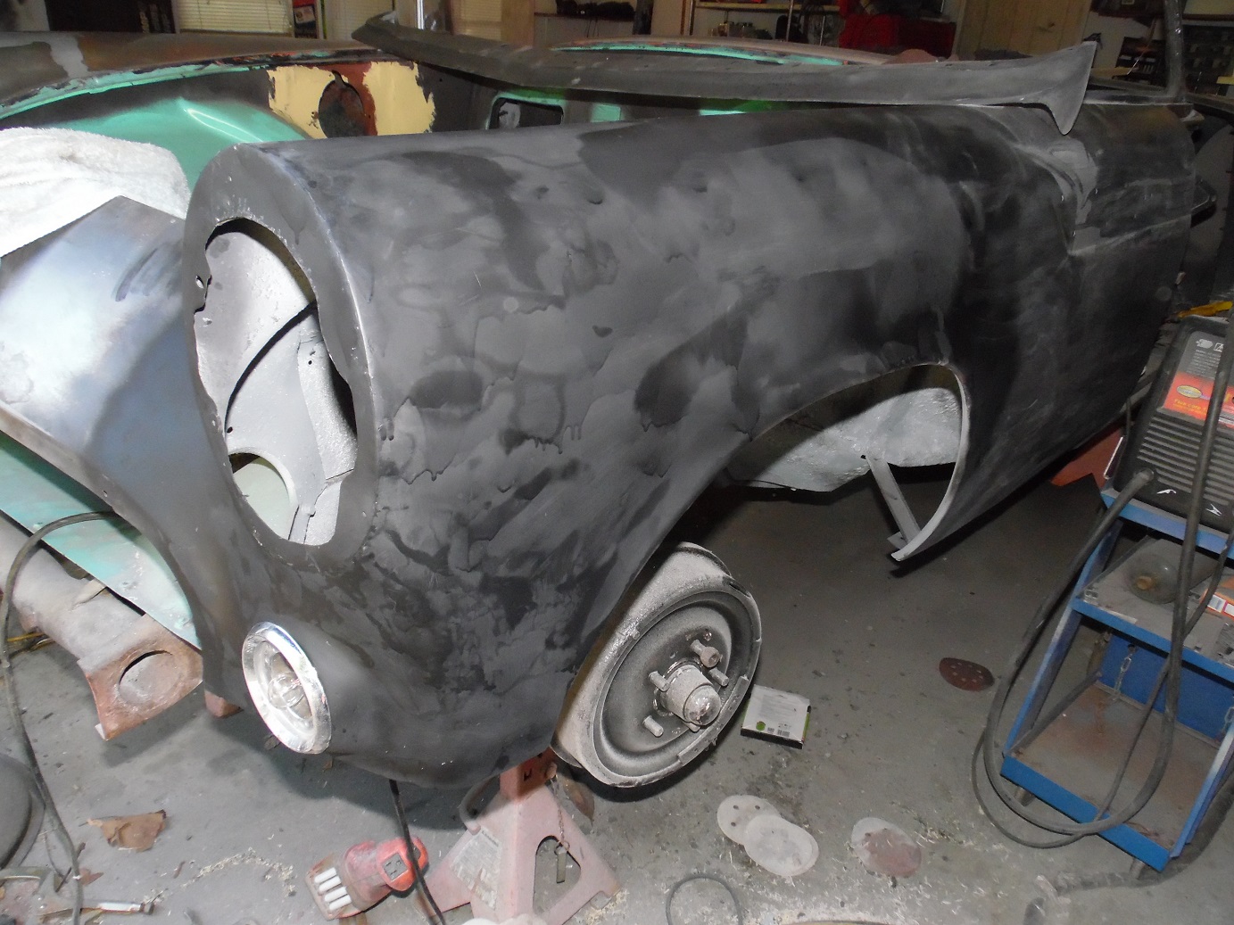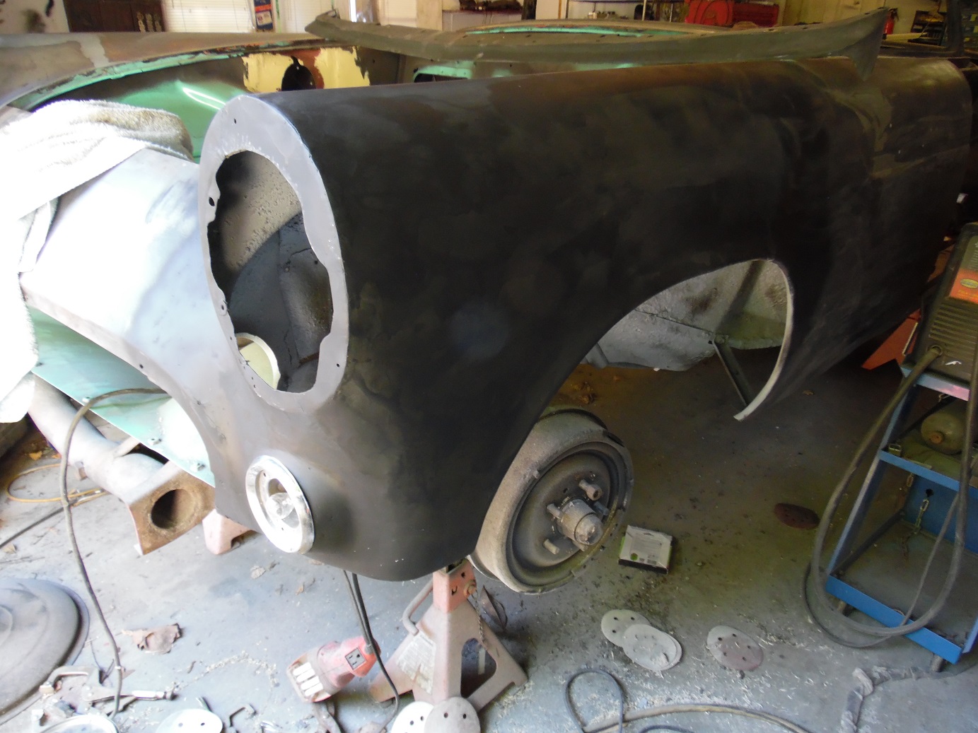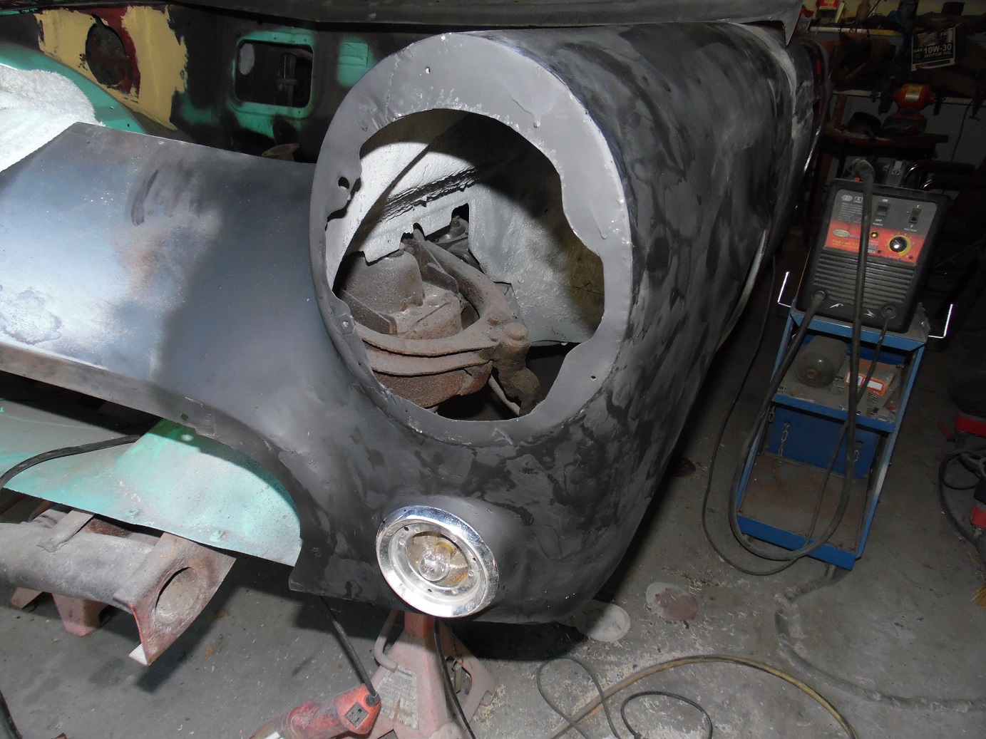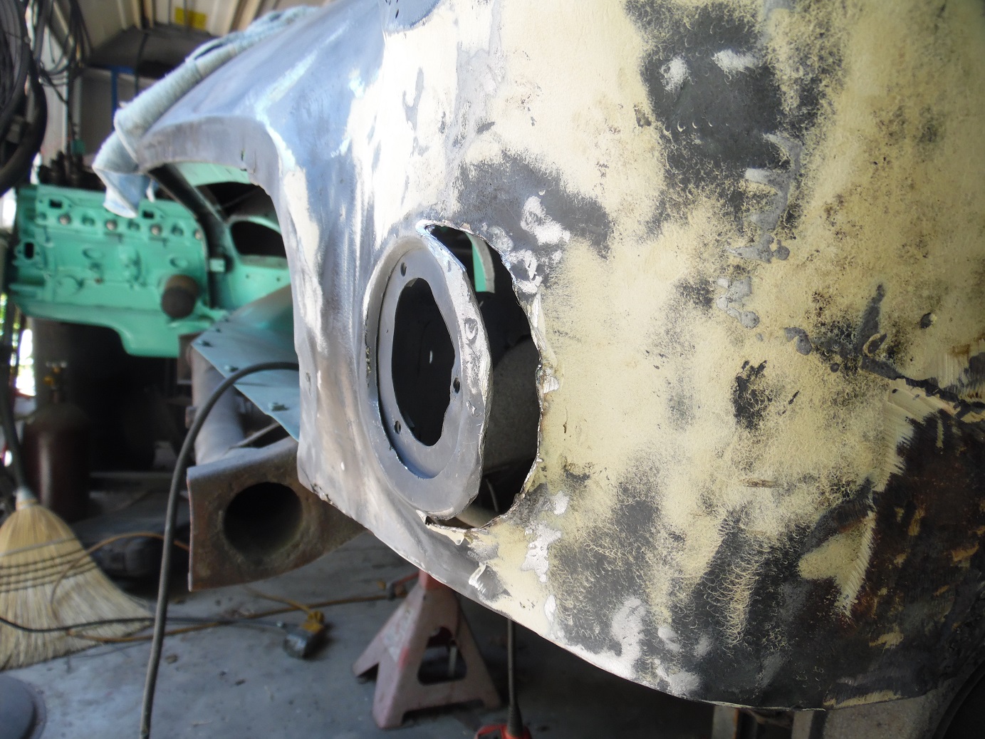 The weld has been removed here. The line drawn around the wheel well is the area that needs to be replaced. It has too many bends and flanges to make by hand. This part has been cut out of a fender on a salvage yard car. Just that piece of a fender took me a month to find and will cost over 600 bucks. A complete fender, if you can find one will run you as much as 2 grand.