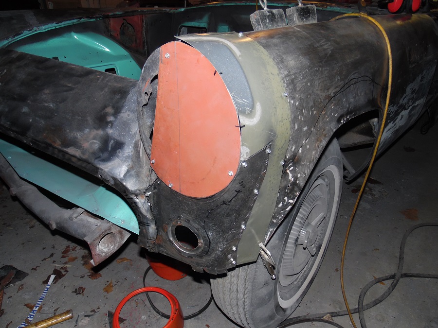 Bottom front piece on the new fender was not useable, so I cut a piece out of the original fender and modified it to fill in.