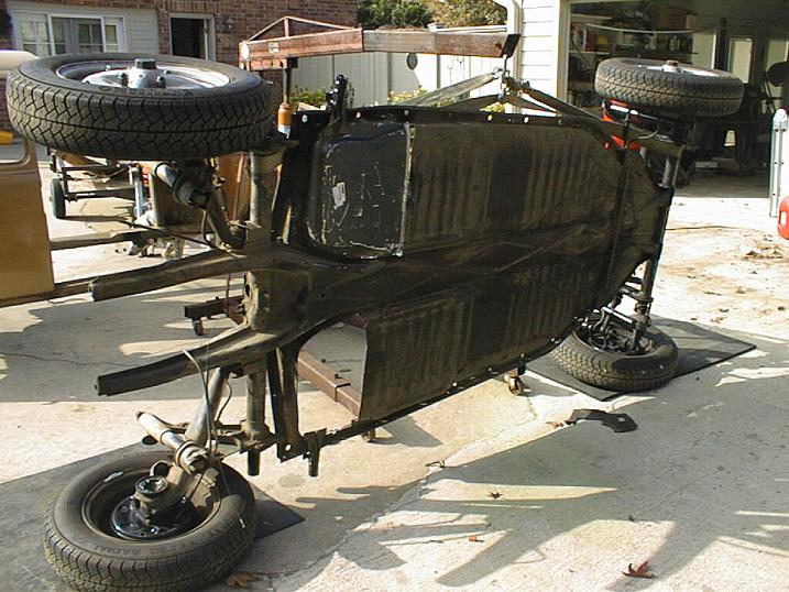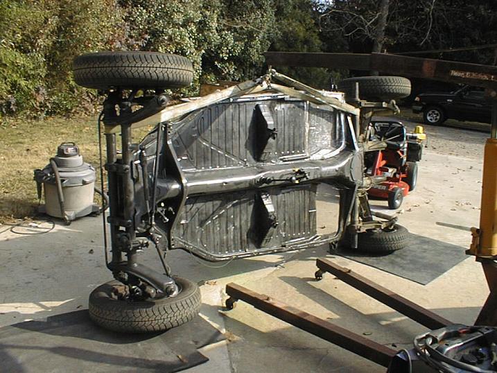 | Using a engine lift, I set the frame on its side and cut out the all the rusted through floor pans. |